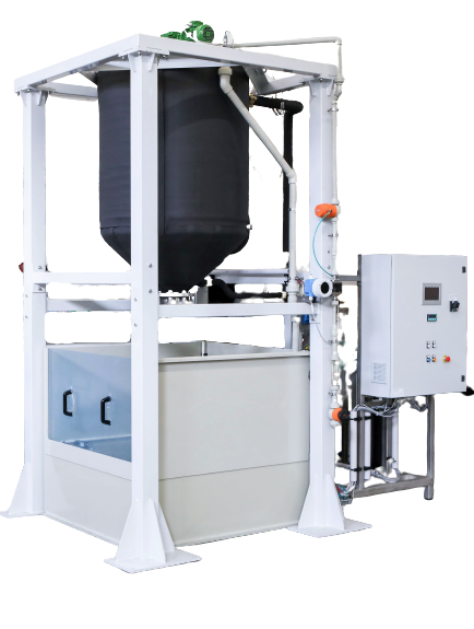 Crystallizer for the precipitation of salts from a saturated solution of an electroplating process bath. The crystallizer mod. CR750 cool down the saturated solution below 10°C obtaining the complete crystallization of the salts. The system is able to process 750 lt/h and the liquid solution obtained from the salts filtration is re-heated up to 40°C and reused in the electroplating process.