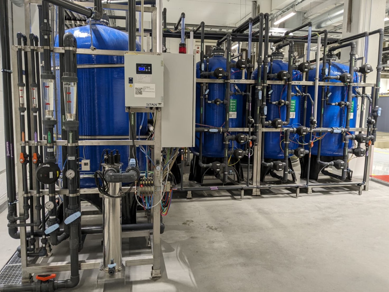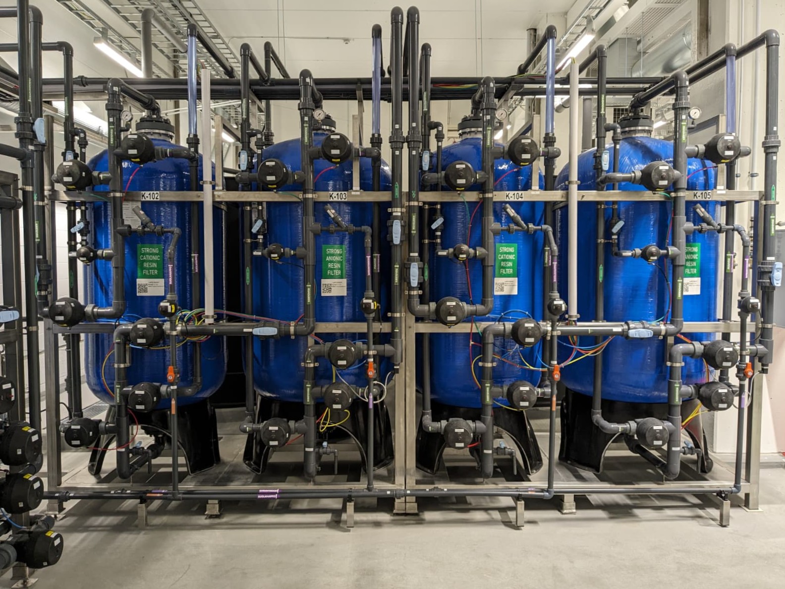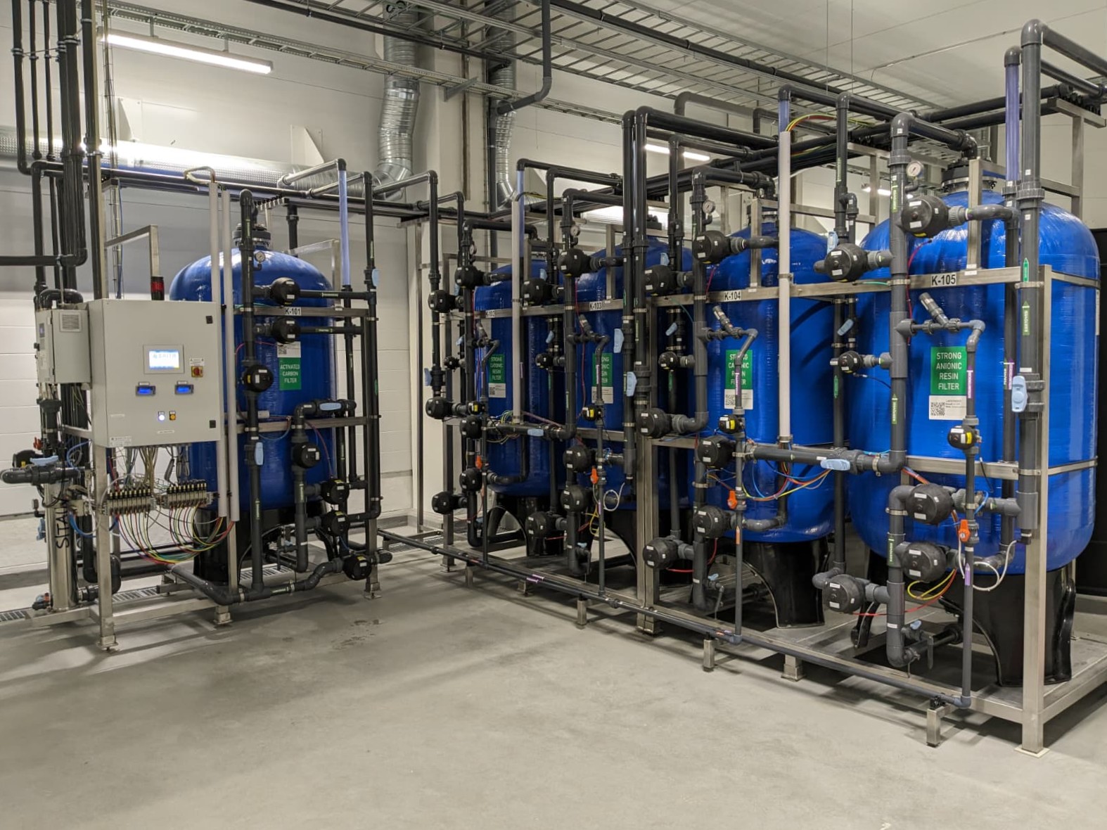 Per il riciclo delle acque di risciacquo della linea di cromatura è stato installato un demineralizzatore a doppia linea (duplex). Il sistema è completamente automatizzato e ridondante, con un filtro a carbone attivo per la ritenzione di sostanze organiche e SST. È stato inoltre installato un sistema di disinfezione UV per garantire la sterilizzazione dell’acqua demineralizzata nel circuito chiuso.