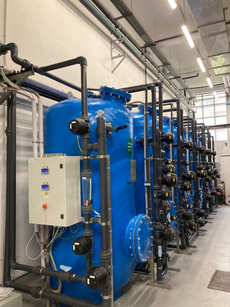 Nuova installazione di un demineralizzatore a riciclo per acque di lavaggio di tre linee galvaniche automatiche a telaio e rotobarile. Il sistema di demineralizzazione installato è totalmente automatico ed in doppia linea per garantire un funzionamento continuo anche durante la fase di rigenerazione. Sono state installate pompe complete di inverter per la regolazione della portata oraria prodotta e strumenti analogici per il controllo della portata oraria, della conducibilità dell’acqua deionizzata prodotta e della conducibilità in uscita dal processo di rigenerazione.