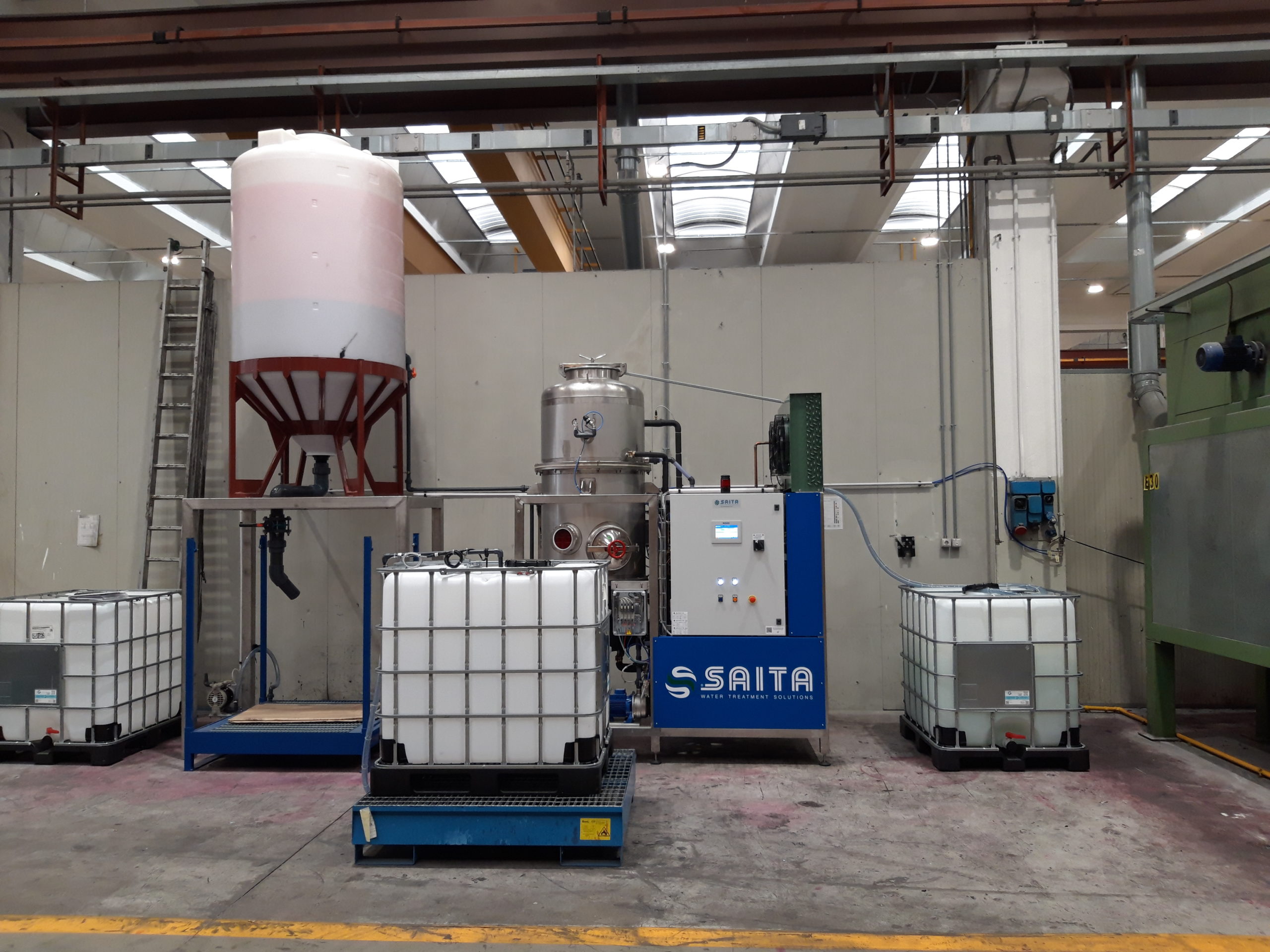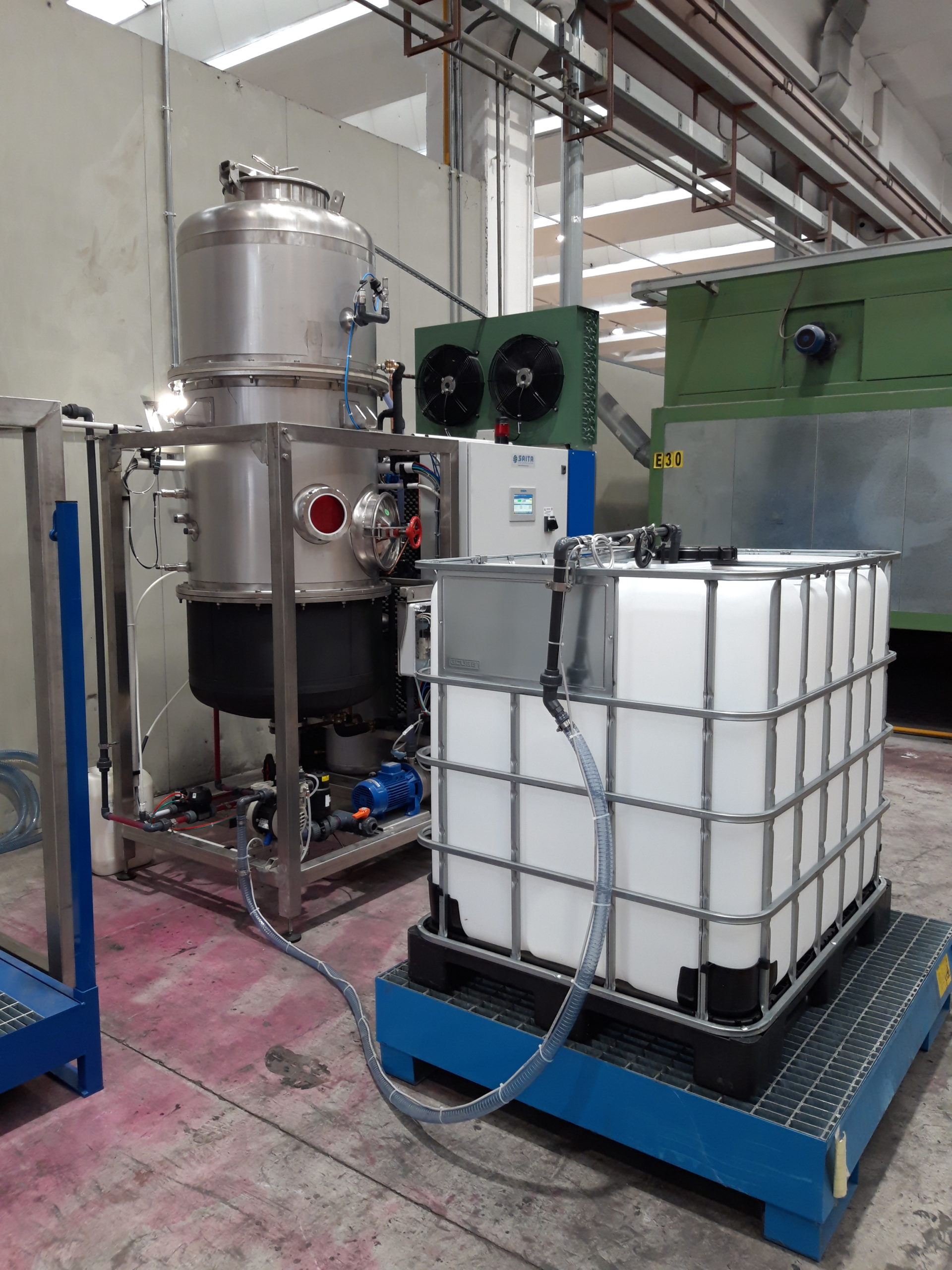 Nuova installazione di un sistema per il trattamento e riciclo dell’acqua contaminata da liquidi penetranti. Scopo del progetto era quello di trattare le acque reflue prodotte da una linea di liquidi penetranti per riciclare l’acqua e ridurre i costi di smaltimento. E’ stato installato un evaporatore sottovuoto in pompa di calore modello EV50 completo di decantatore per una pre-sedimentazione dei solidi sospesi. Grazie a questo sistema il nostro cliente è in grado di recuperare più del 90% dell’acqua distillata per le fasi di lavaggio della linea di liquidi penetranti.